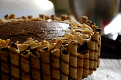 It's not any chocolate cake. This one is from my favorite cookbook author- Ina Garten! According to Ina, this is the most fabulous chocolate cake she has ever made.I must add that, it is mine too! I still remember how nice and moist it was when I baked it for a party last time. This time, having more time on hand, I decided to dress up this homey cake, and adopted Alice Medrich's whipped ganache as filling, and Southern Living's idea of using Pirouline to line the edge of the cake. The result was pretty interesting although I must admit that my decorating skills have plenty of rooms for improvement....
